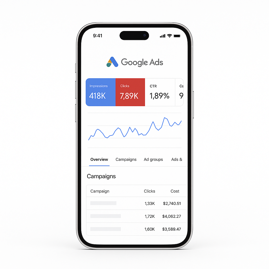 We work with the entire Google Ads suite, including Search (PPC), Display, Shopping, YouTube (Video), and Performance Max campaigns. We analyze your product catalog, budget, and objectives to recommend the most effective advertising strategy. We also handle the integration of remarketing, product feeds, and advanced tracking.